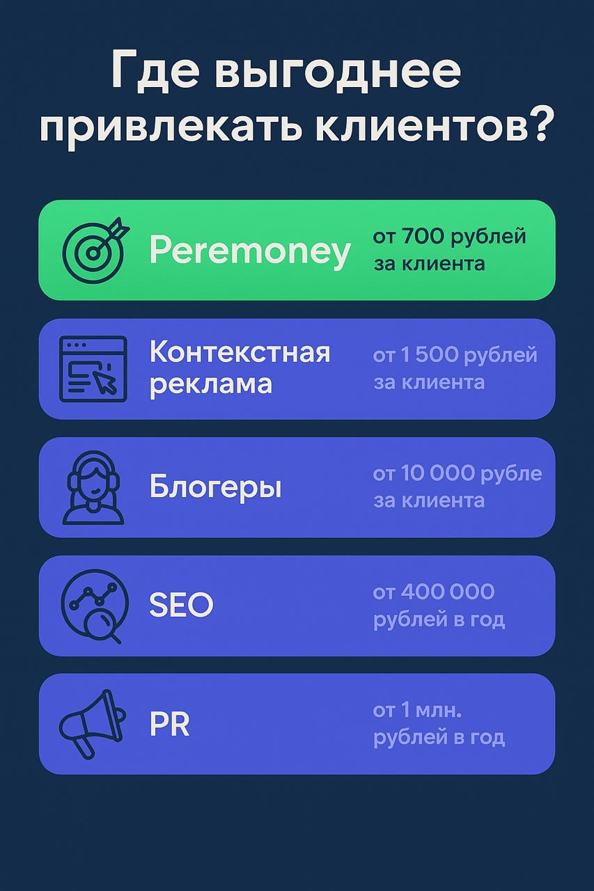 Агентство Peremoney помогает бизнесам строить стратегии привлечения клиентов через перехват лидов, таргетинг, SEO и комплексные маркетинговые инструменты, обеспечивая максимальную отдачу и рост.